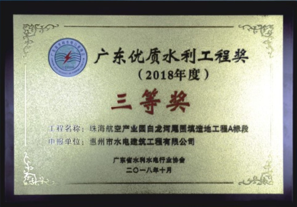 廣東優(yōu)質(zhì)水利工程獎(三等獎)——珠海航空產(chǎn)業(yè)園白龍河尾圍填造地工程A標段