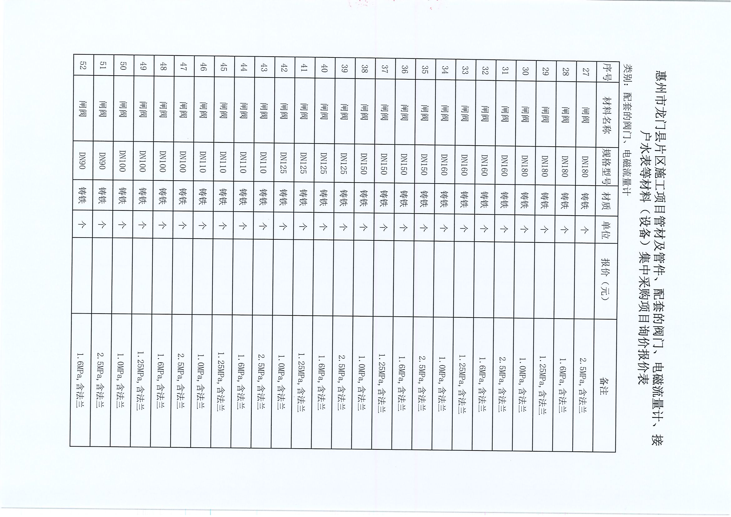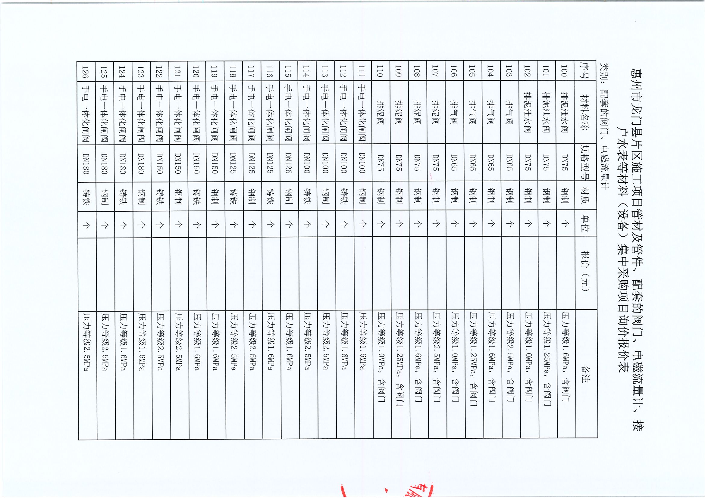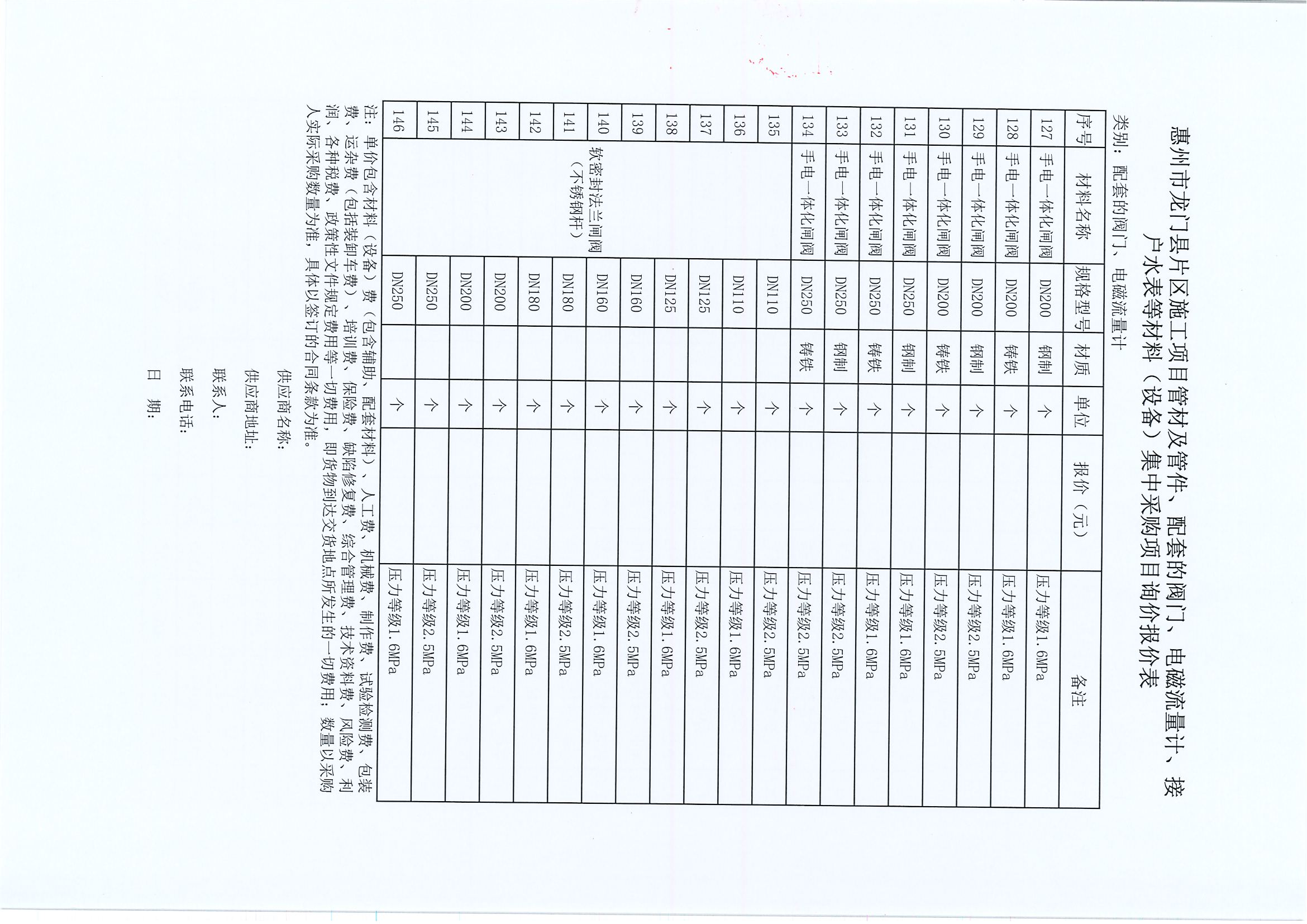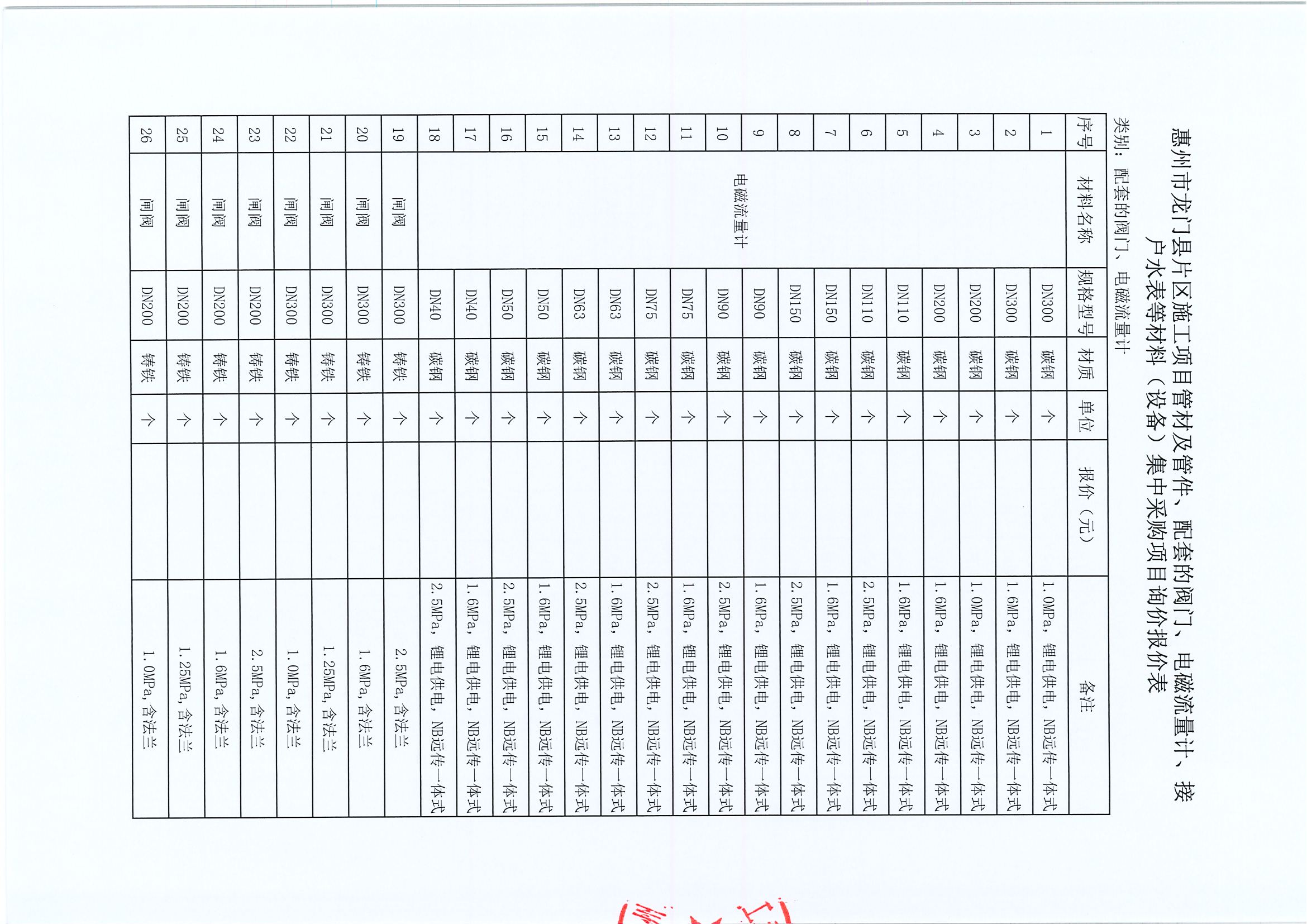 惠州市龍門縣片區(qū)施工項目管材及管件、配套的閥門、電磁流量計、接戶水表等材料(設(shè)備)集中采購項目詢價公告