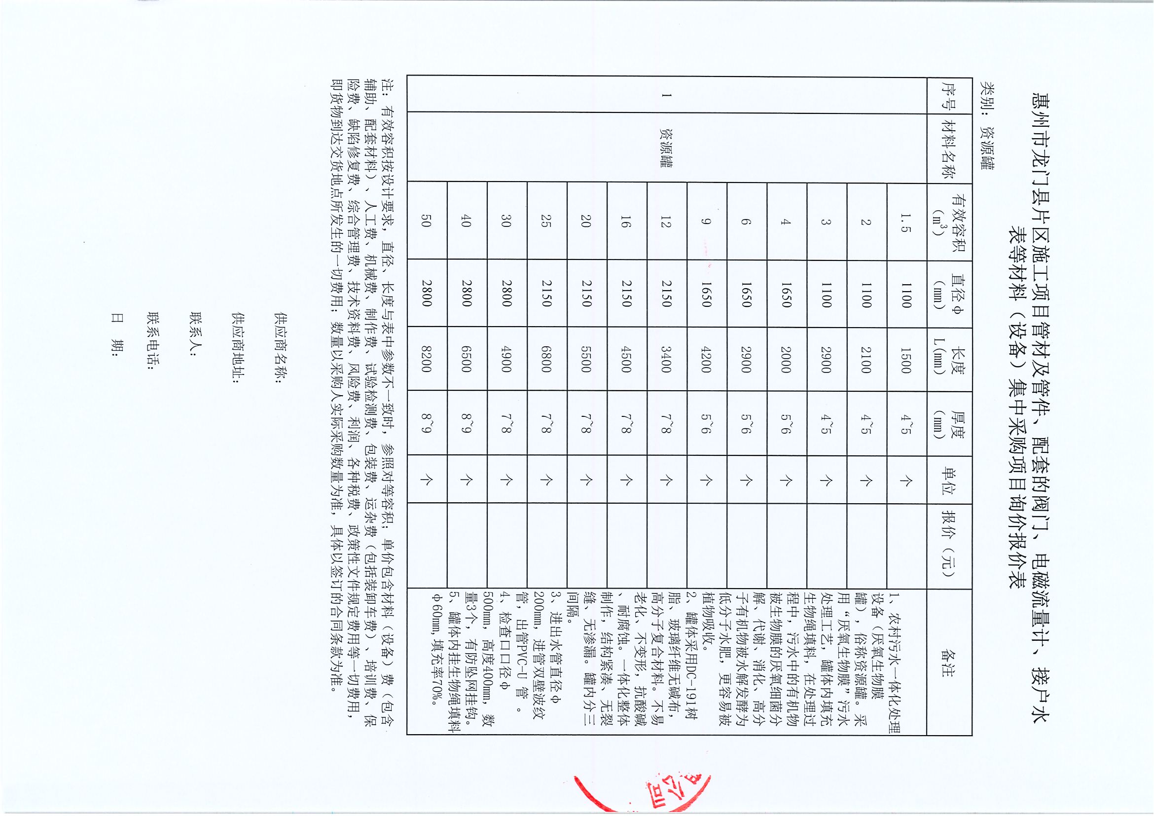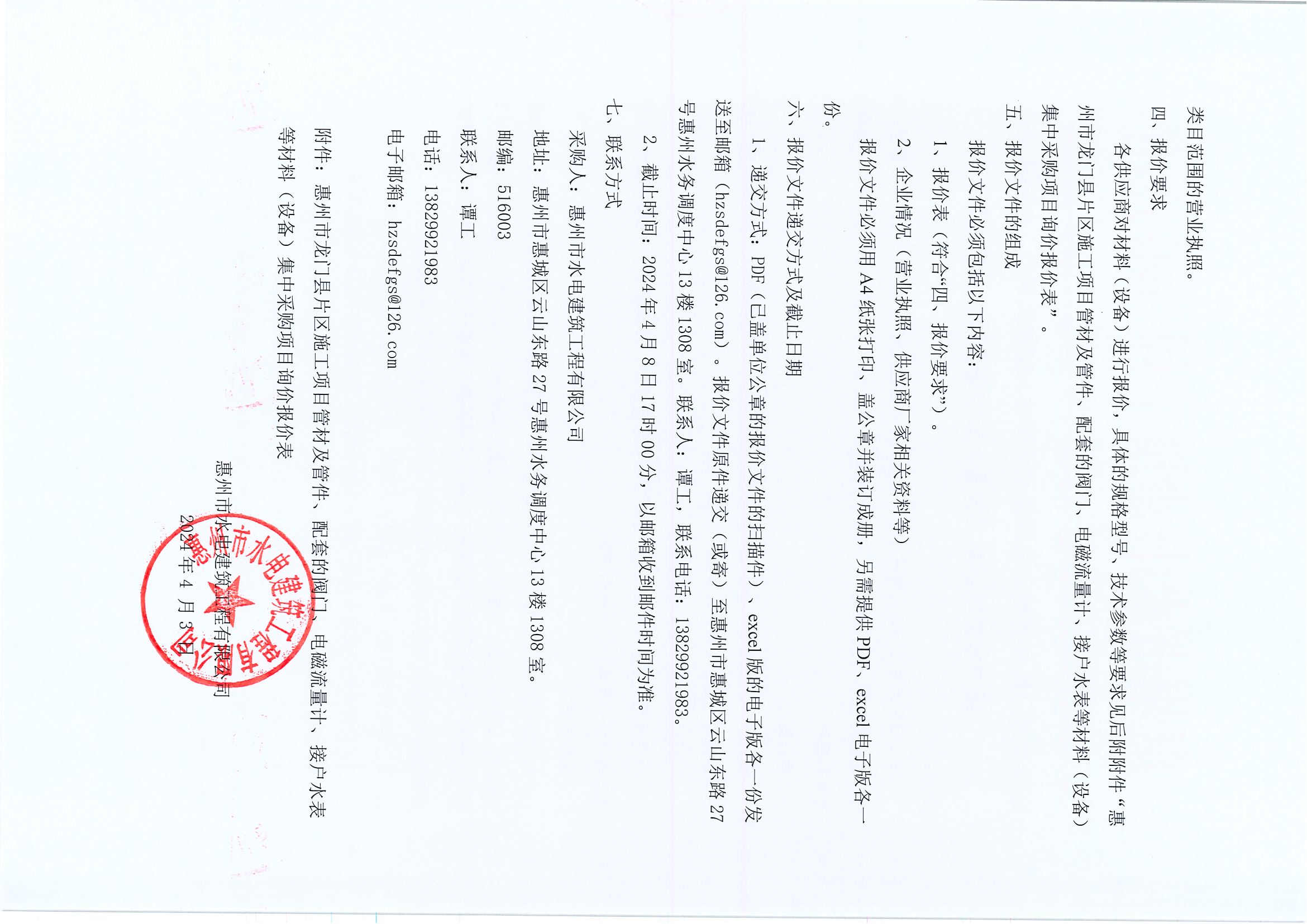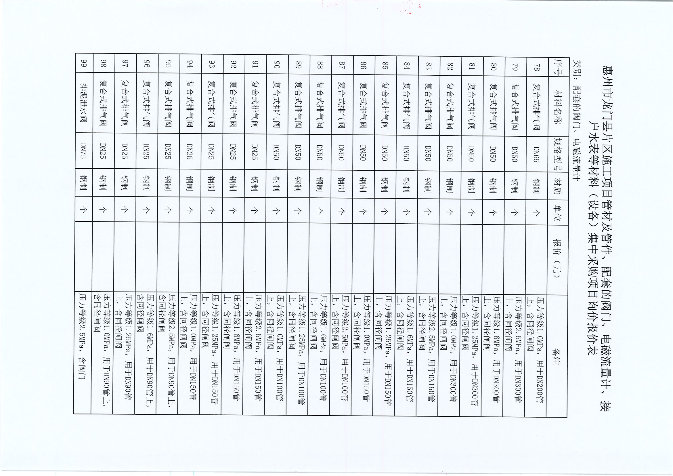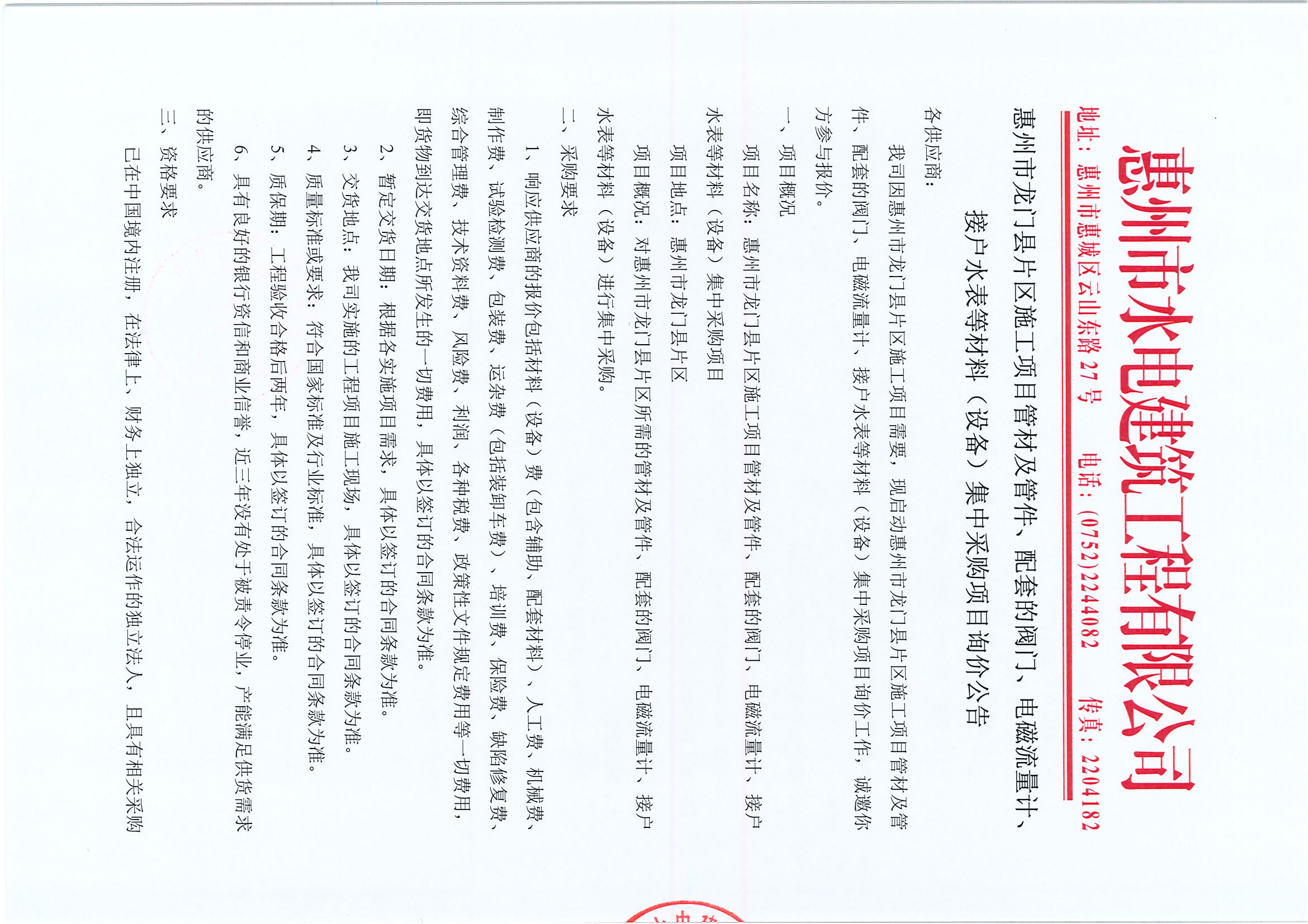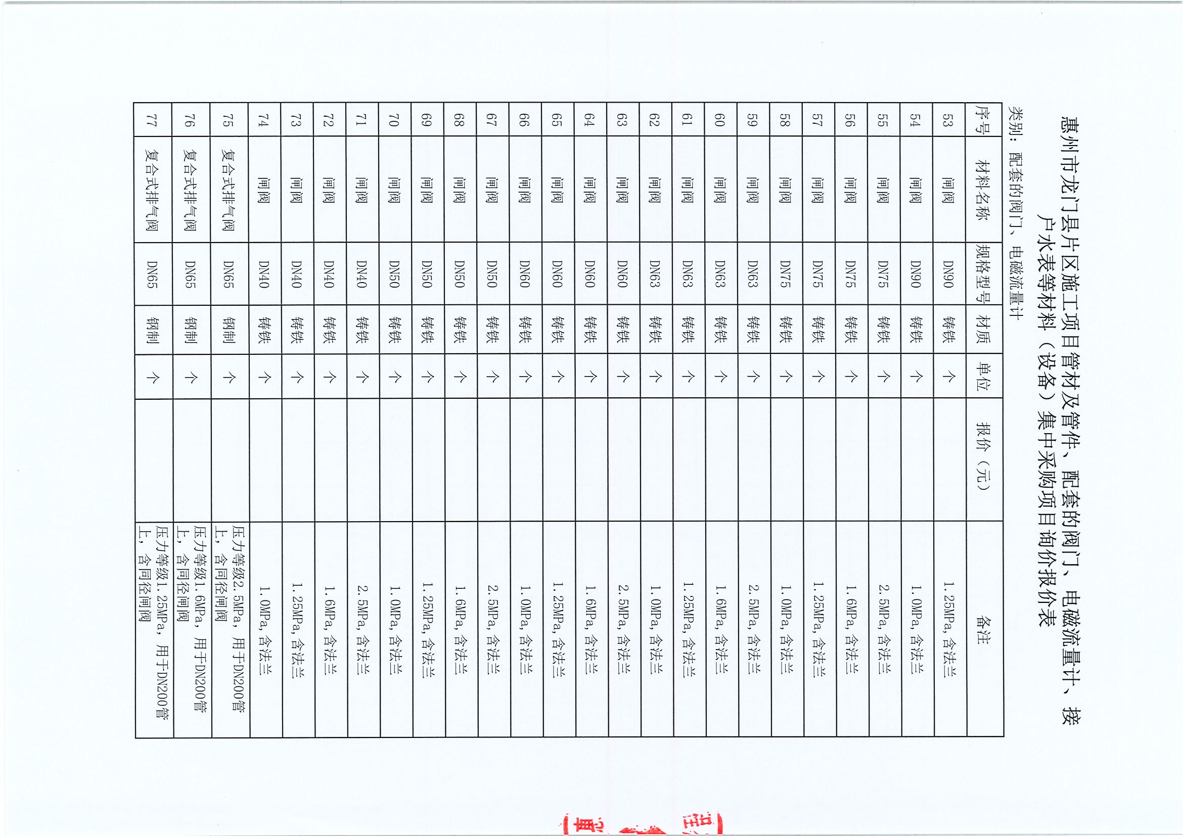 惠州市龍門縣片區(qū)施工項目管材及管件、配套的閥門、電磁流量計、接戶水表等材料(設(shè)備)集中采購項目詢價公告
