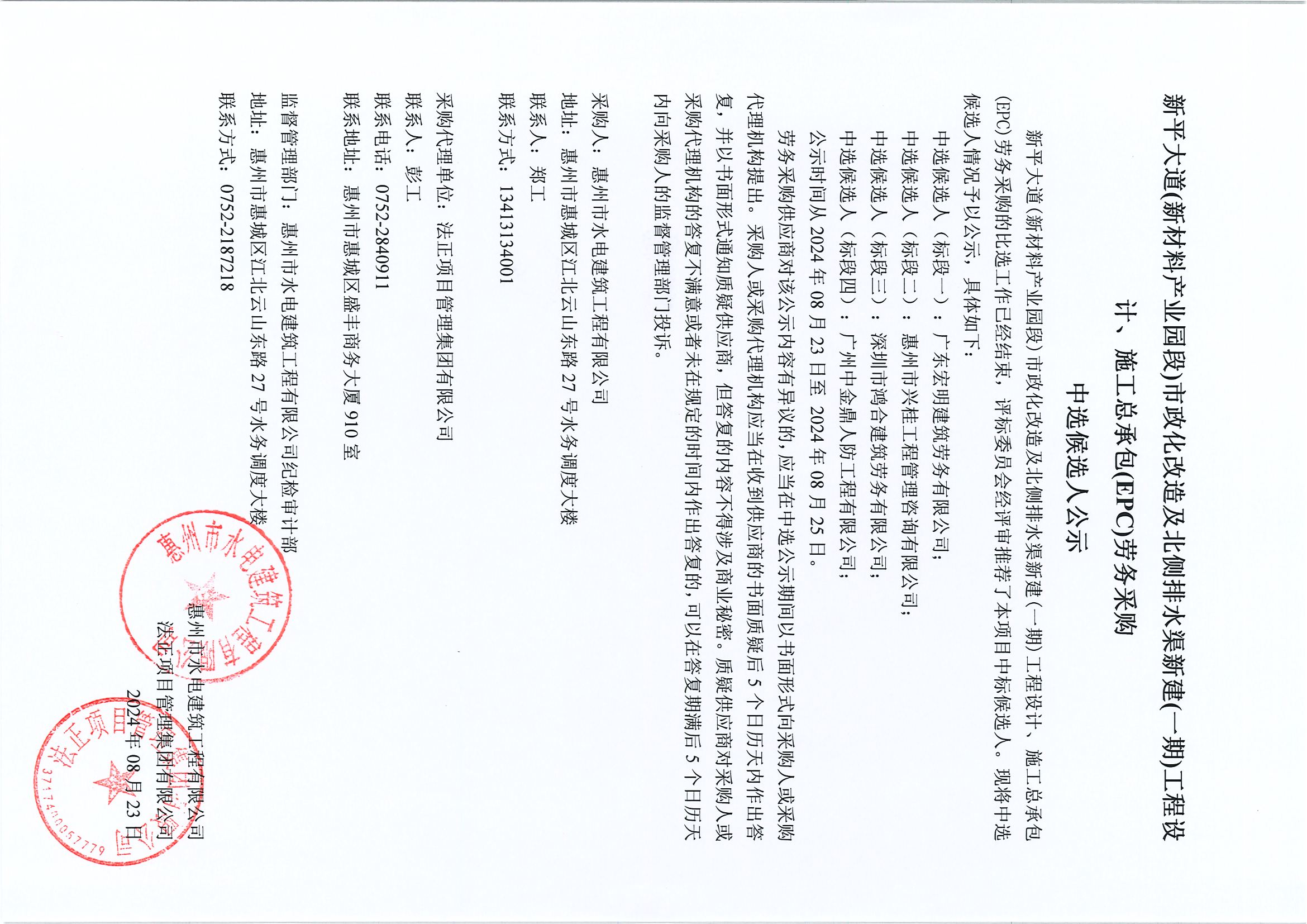 惠州新材料產業(yè)園起步區(qū)地塊土石方場平工程(四區(qū))項目一期施工圖設計、施工總承包(EPC)勞務采購中選候選人公示
