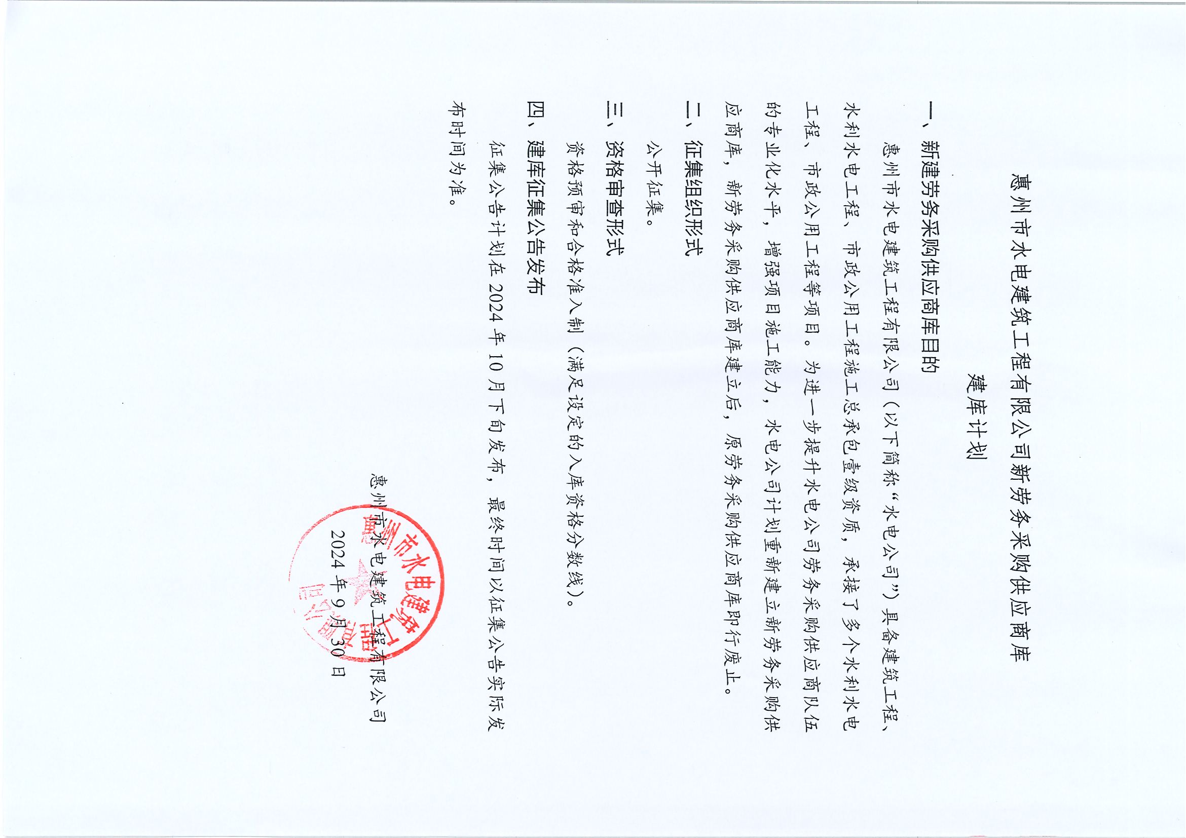 惠州市水電建筑工程有限公司新勞務(wù)采購(gòu)供應(yīng)商庫(kù)建庫(kù)計(jì)劃