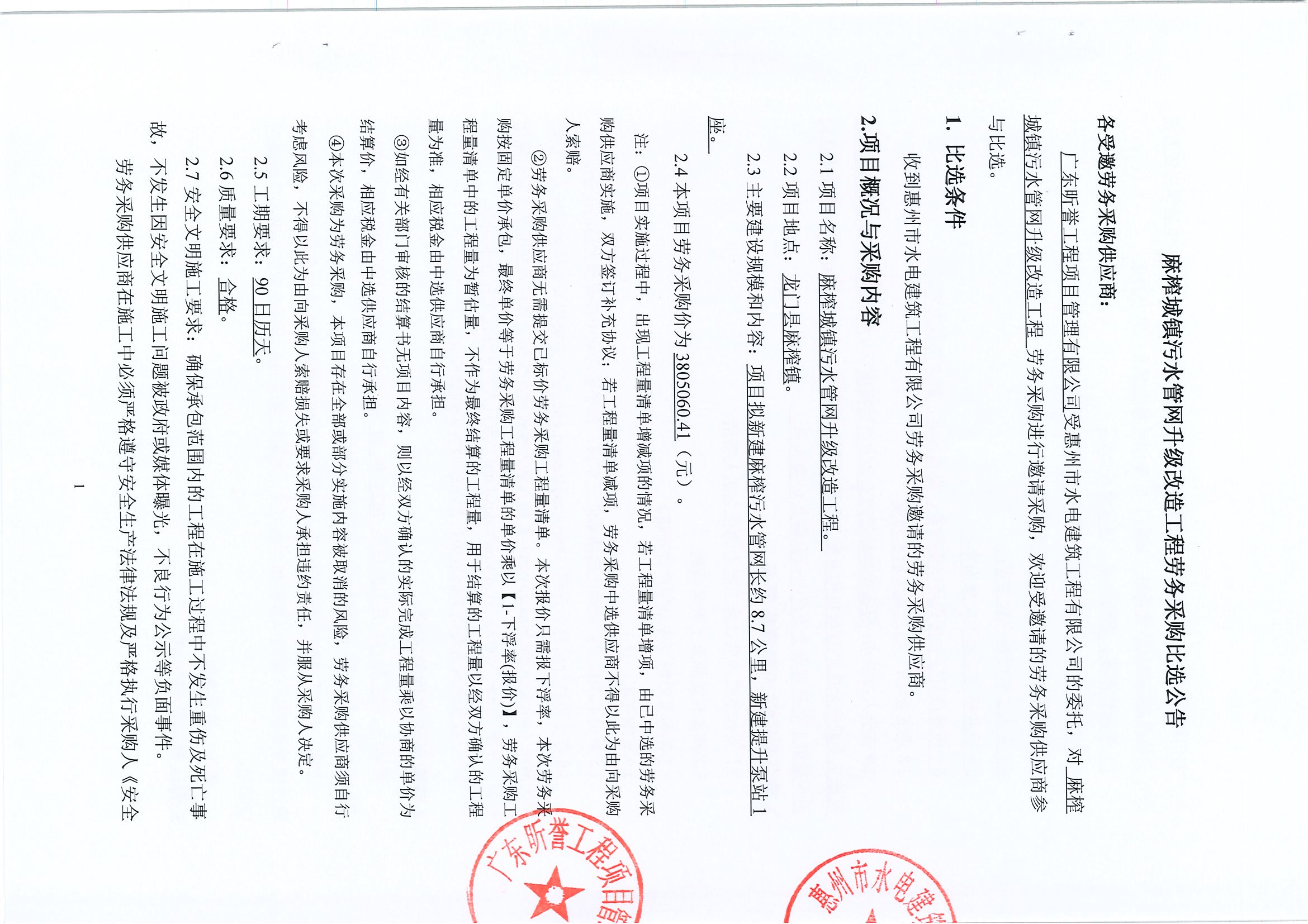 麻榨城鎮(zhèn)污水管網升級改造工程勞務采購比選公告