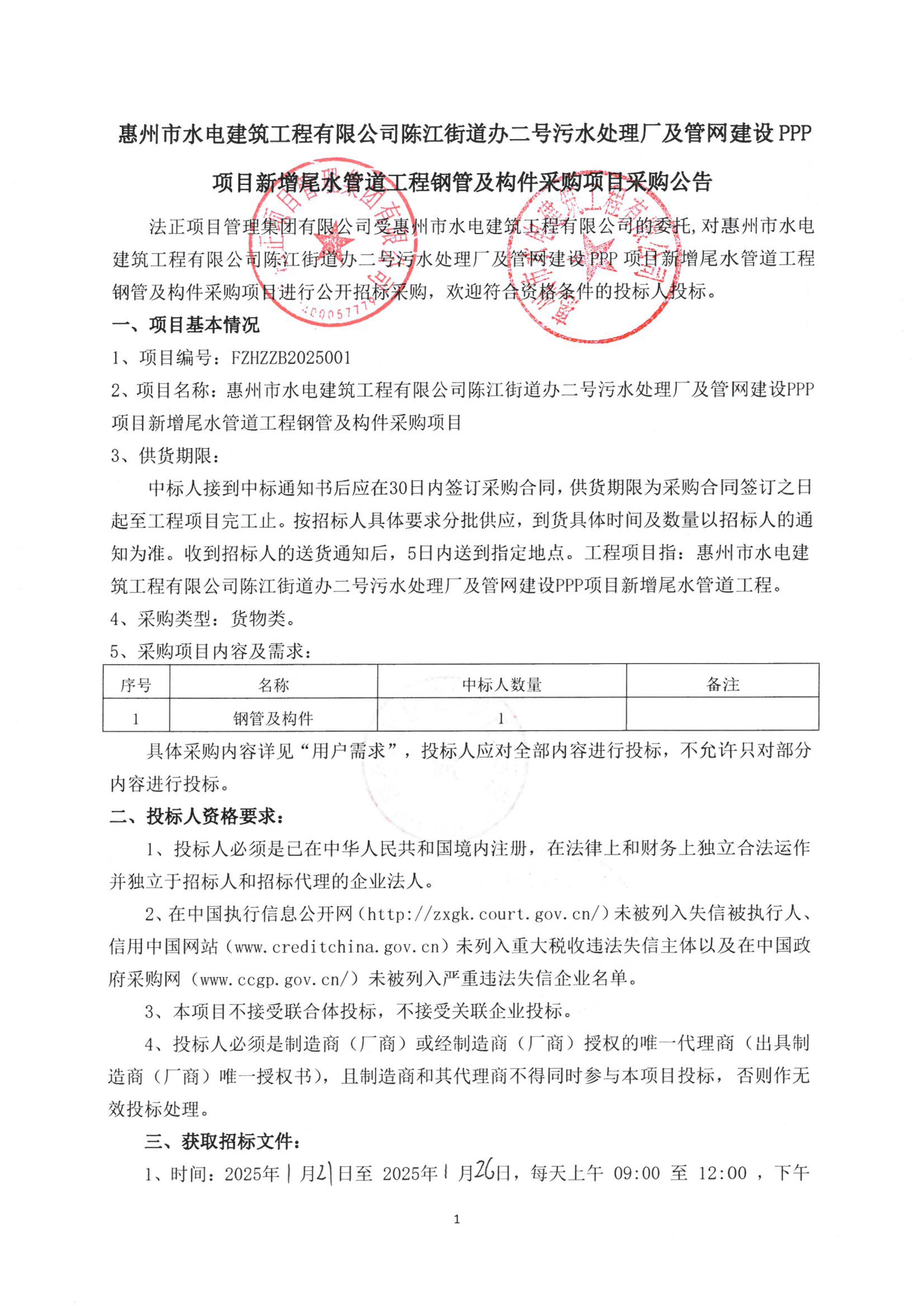 陳江街道辦二號污水處理廠及管網(wǎng)建設PPP項目新增尾水管道工程鋼管及構件采購項目采購公告