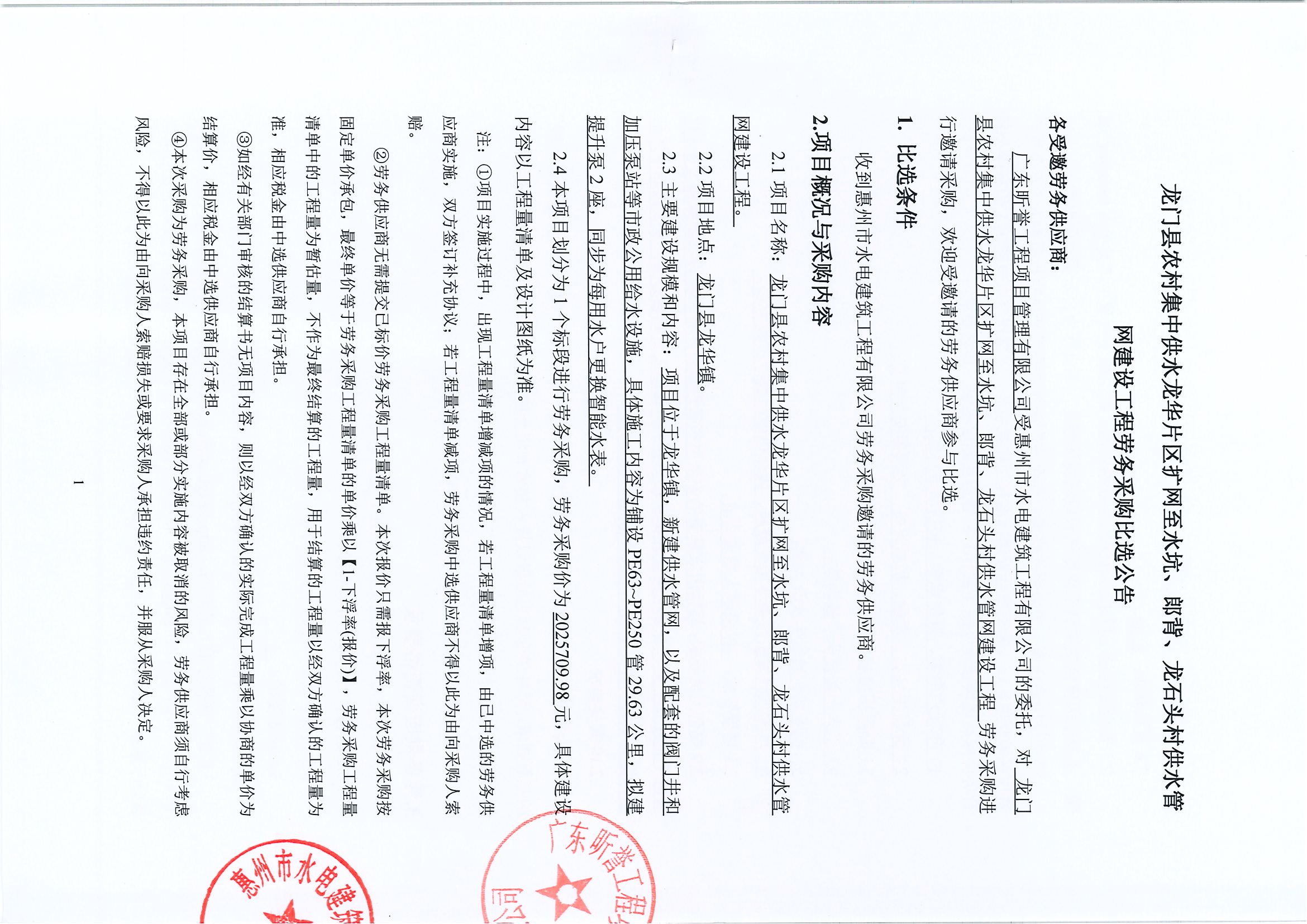 龍門縣農(nóng)村集中供水龍華片區(qū)擴(kuò)網(wǎng)至水坑、郎背、龍石頭村供水管網(wǎng)建設(shè)工程勞務(wù)采購比選公告