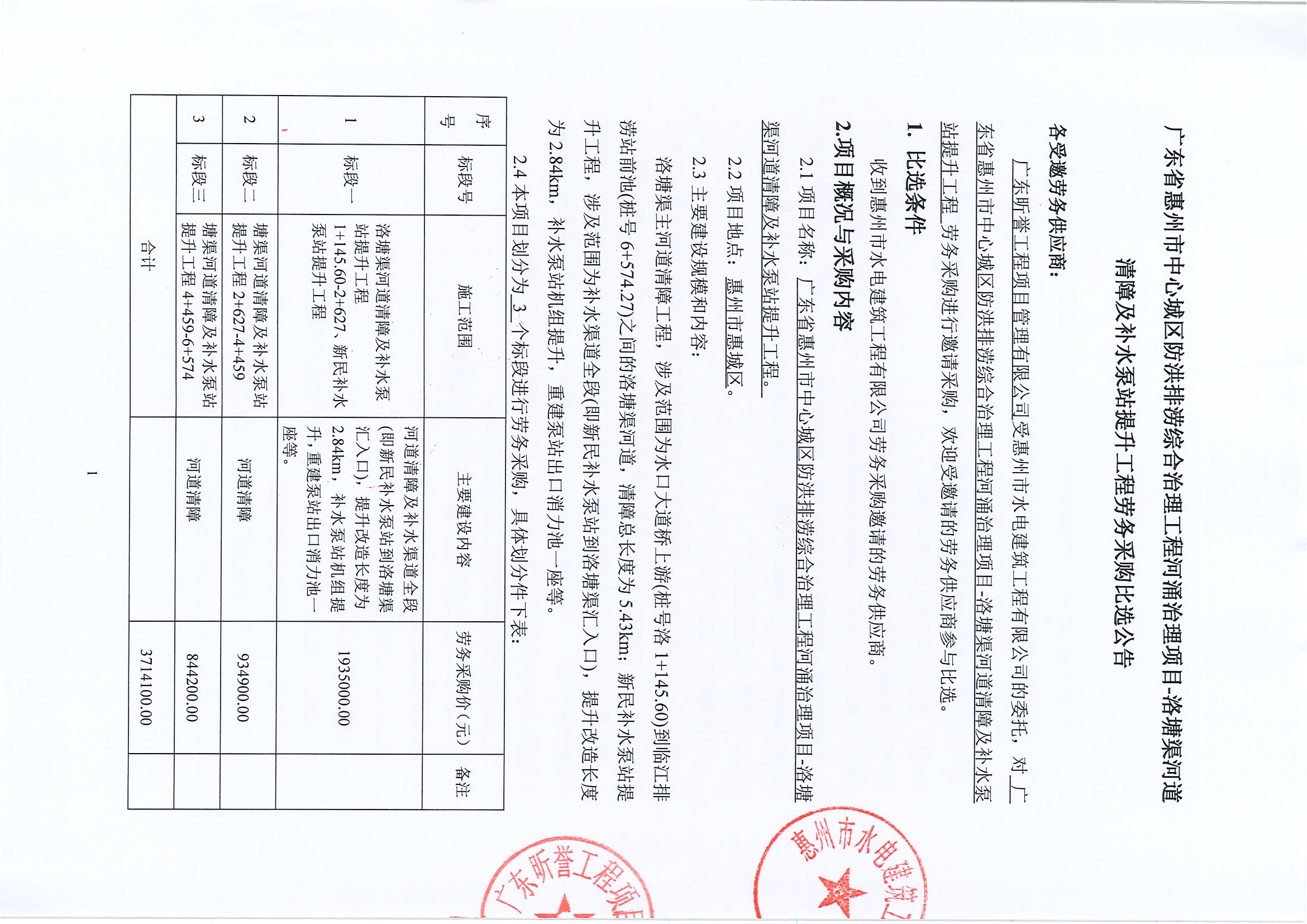 廣東省惠州市中心城區(qū)防洪排澇綜合治理工程河涌治理項目-洛塘渠河道清障及補水泵站提升工程勞務采購比選公告