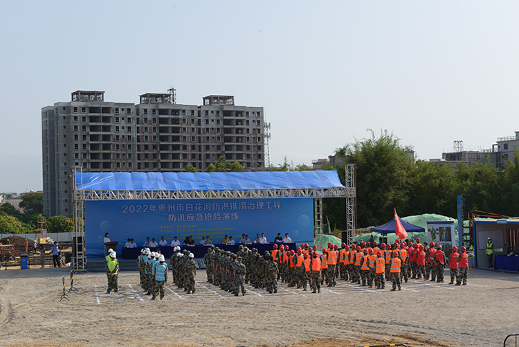 為立足“防大汛、搶大險(xiǎn)、救大災(zāi)”,貫徹落實(shí)“三防”工作部署,4月15日下午,由惠東縣人民政府主辦,惠東縣水利局、市水電建筑工程有限公司、省水利電力勘測設(shè)計(jì)研究院有限公司共同承辦的“2022年惠州市白花河防洪排澇治理工程防汛應(yīng)急搶險(xiǎn)演練”在白花河項(xiàng)目施工現(xiàn)場成功舉行。演練指揮長惠東縣人民政府副縣長曹慧、惠州市水利局副局長曾國良及公司黨委書記、董事長鄭海強(qiáng),黨委副書記李海忠蒞臨演練現(xiàn)場觀摩指導(dǎo)。