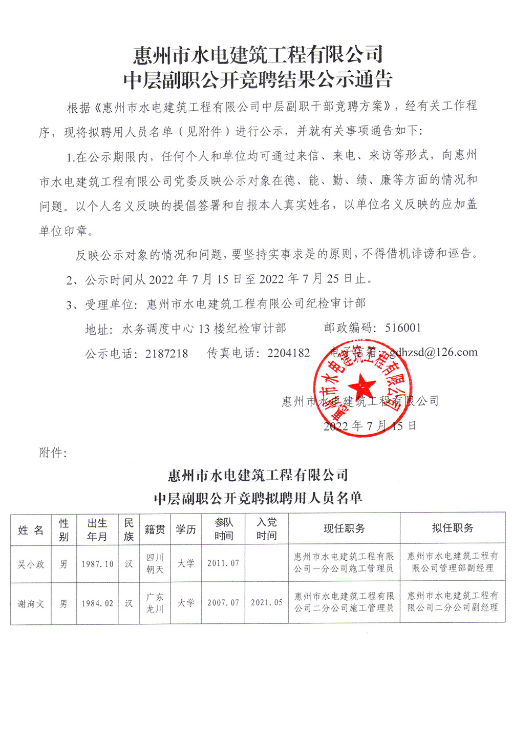 惠州市水電建筑工程有限公司中層副職公開競(jìng)聘結(jié)果公示