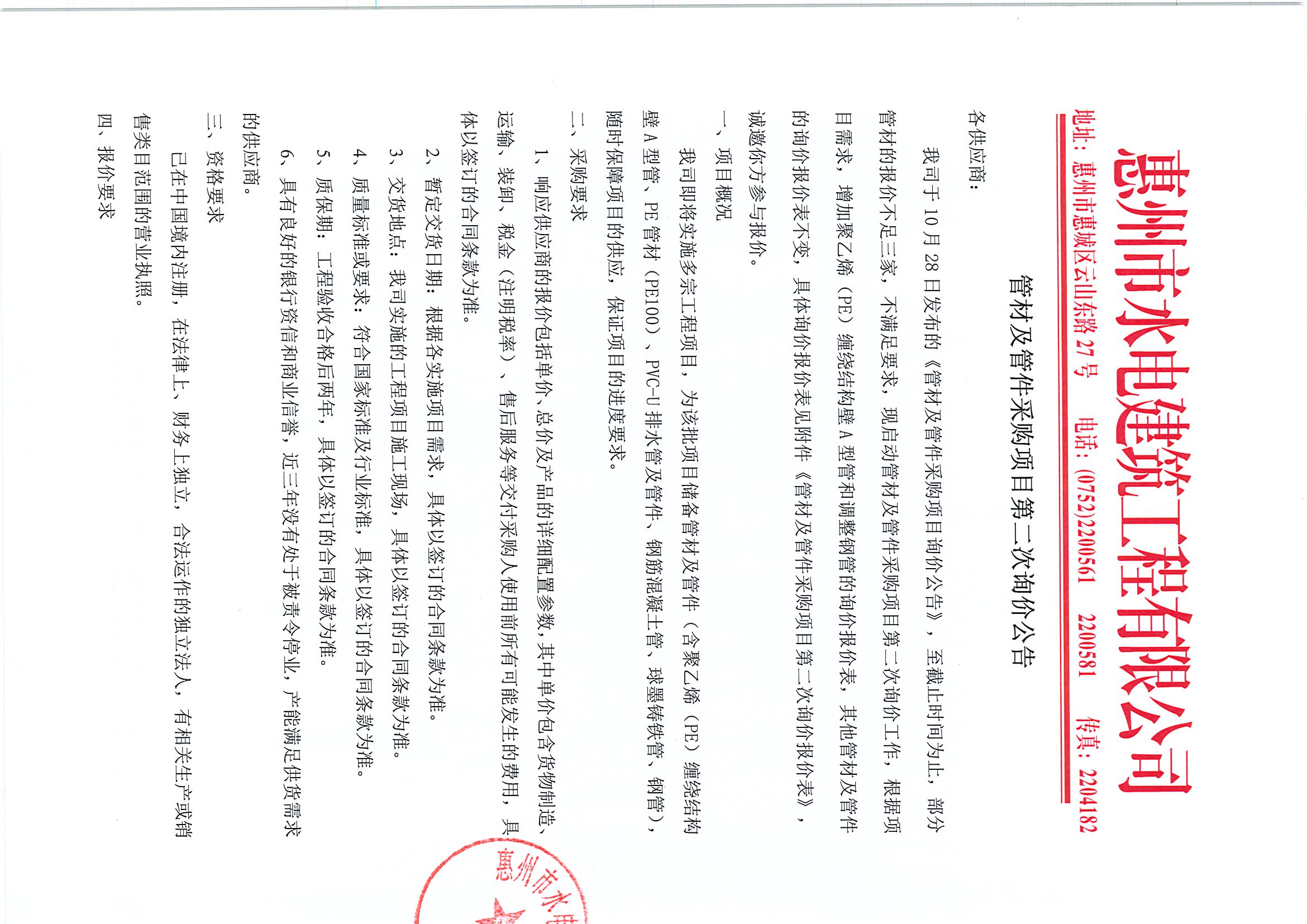 管材及管件采購項(xiàng)目第二次詢價公告