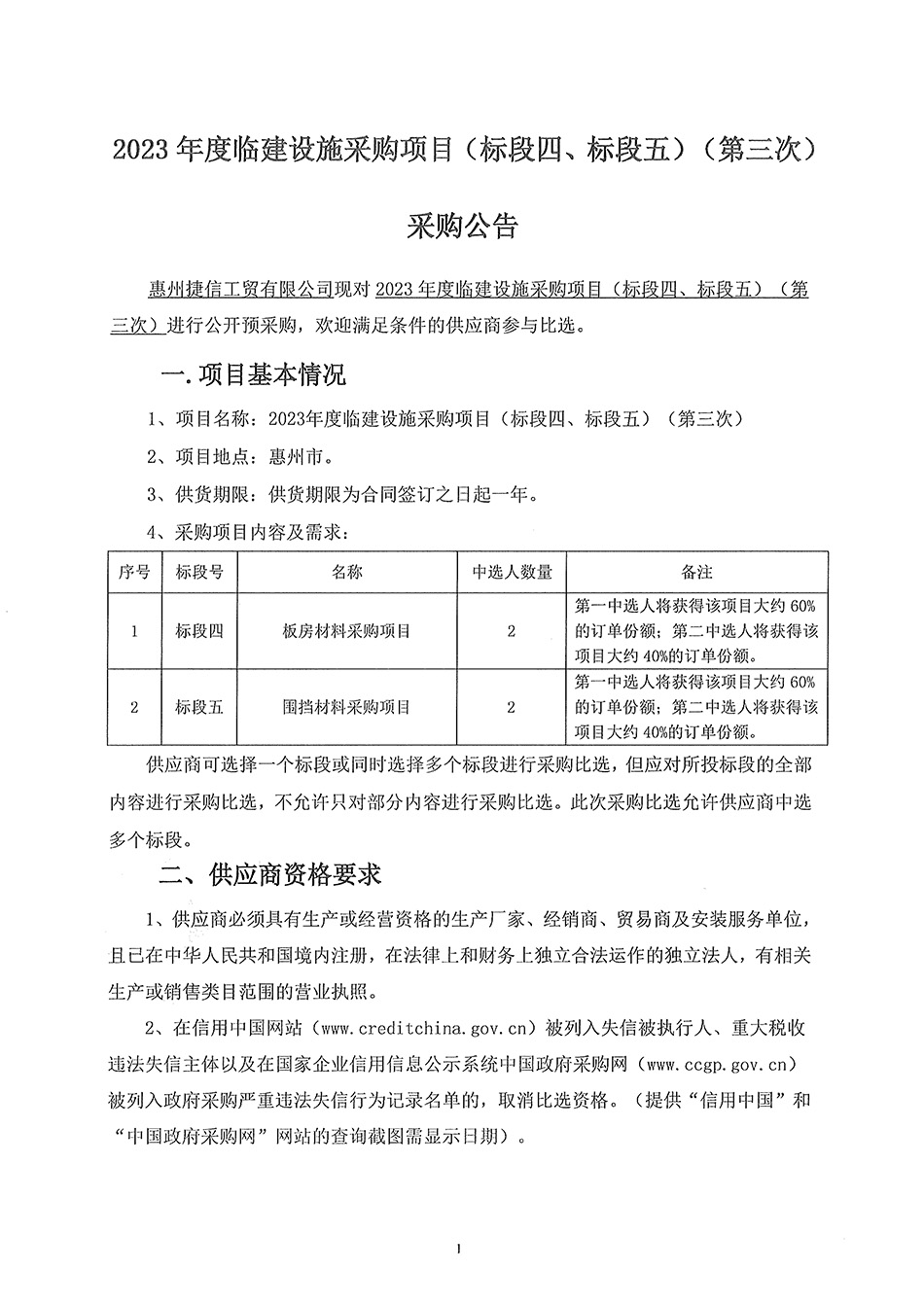 捷信工貿(mào)公司2023年度臨建設(shè)施采購項目(第四次)采購公告