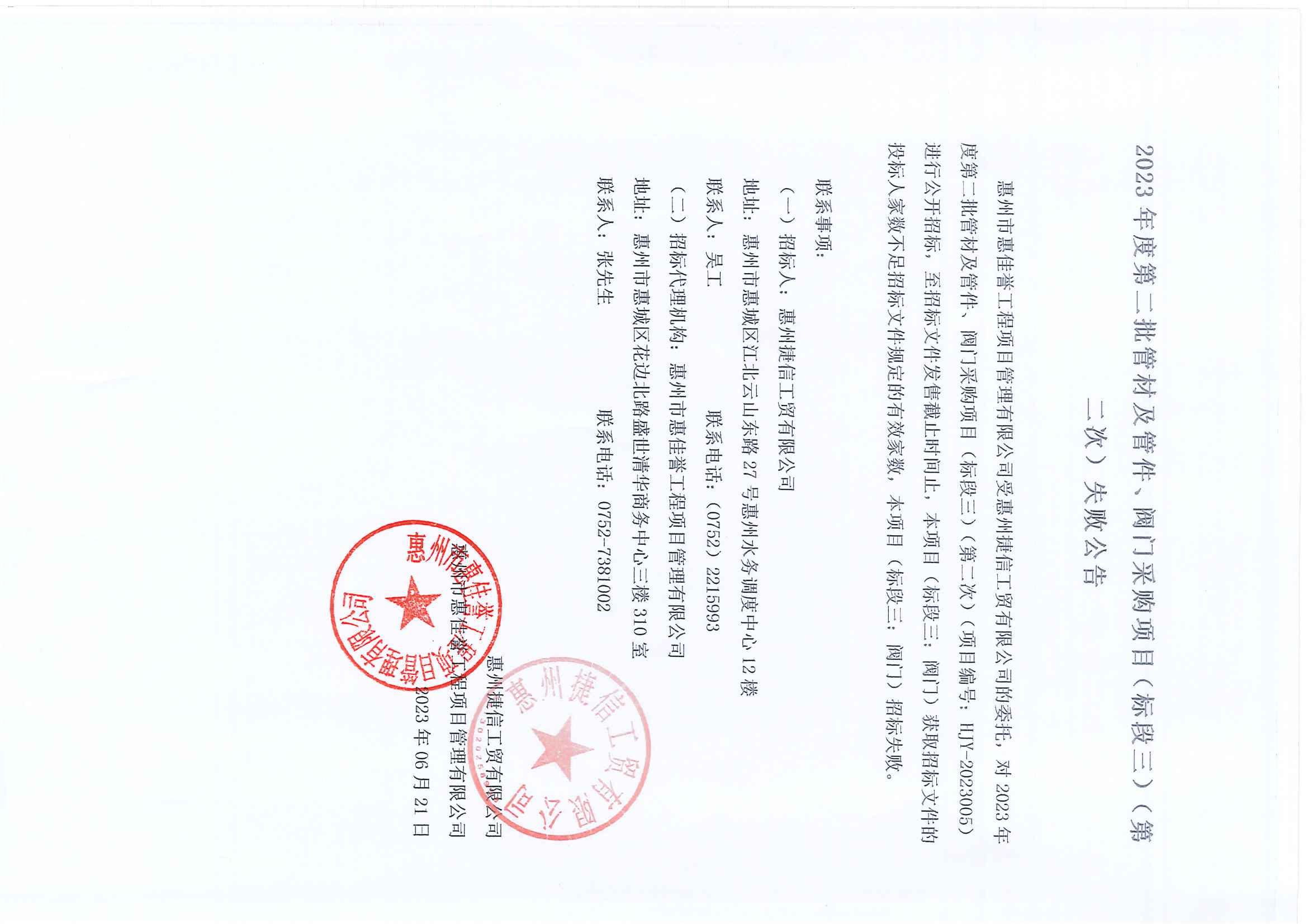 捷信工貿(mào)公司2023年度第二批管材及管件、閥門(mén)采購(gòu)項(xiàng)目(標(biāo)段三)(第二次)失敗公告