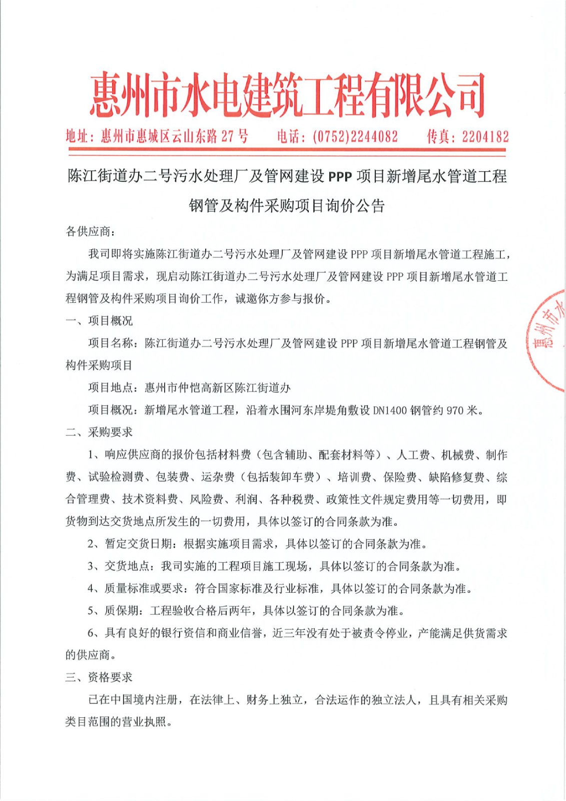 陳江街道辦二號(hào)污水處理廠(chǎng)及管網(wǎng)建設(shè)PPP項(xiàng)目新增尾水管道工程鋼管及構(gòu)件采購(gòu)項(xiàng)目第二次詢(xún)價(jià)公告附件:/upload/202412/09/202412091458001110.xls......