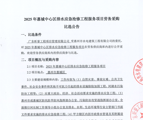 2025年惠城中心區(qū)排水應(yīng)急搶修工程服務(wù)項(xiàng)目勞務(wù)采購(gòu)比選公告......