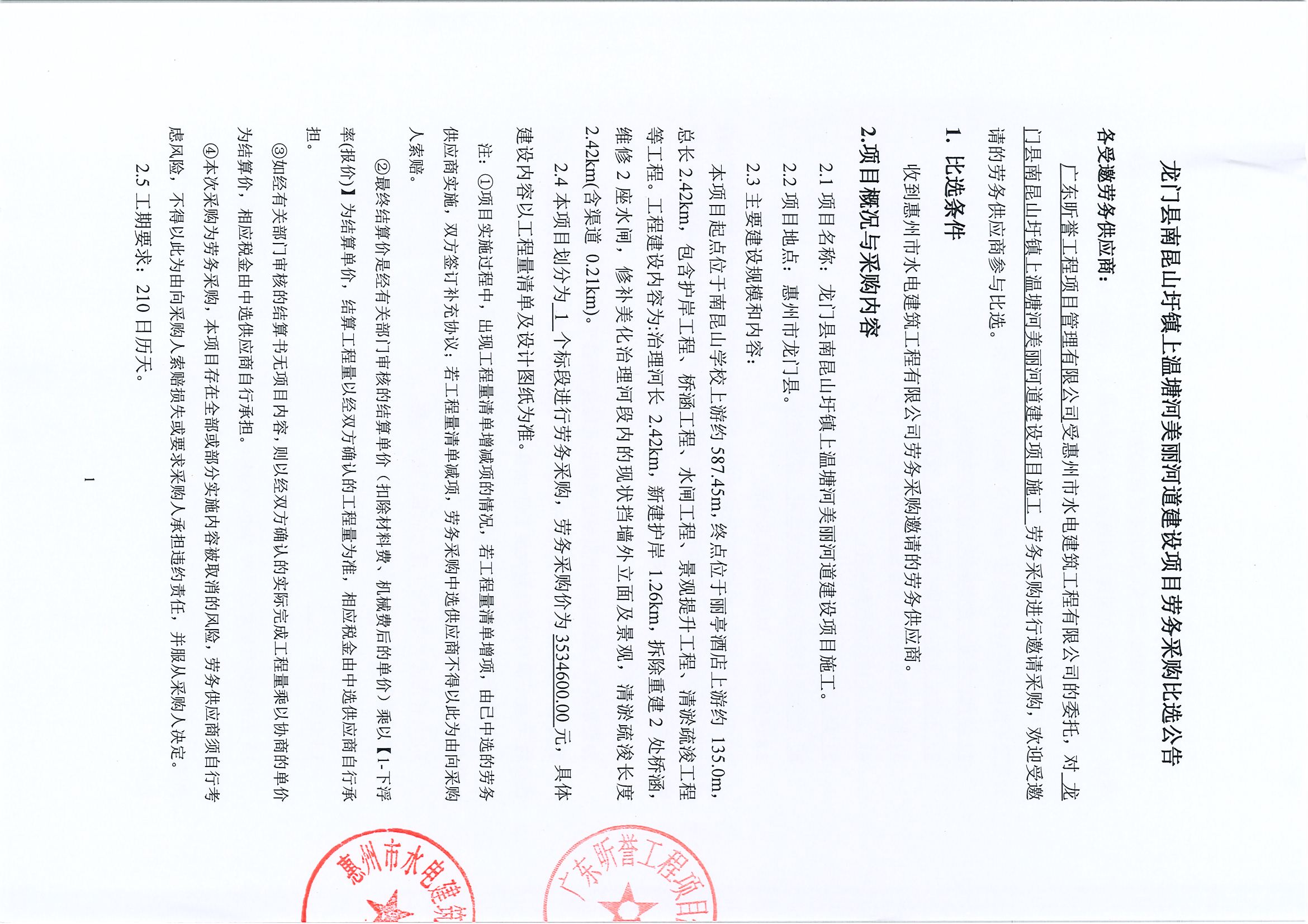 龍門縣南昆山圩鎮(zhèn)上溫塘河美麗河道建設(shè)項目勞務(wù)采購比選公告