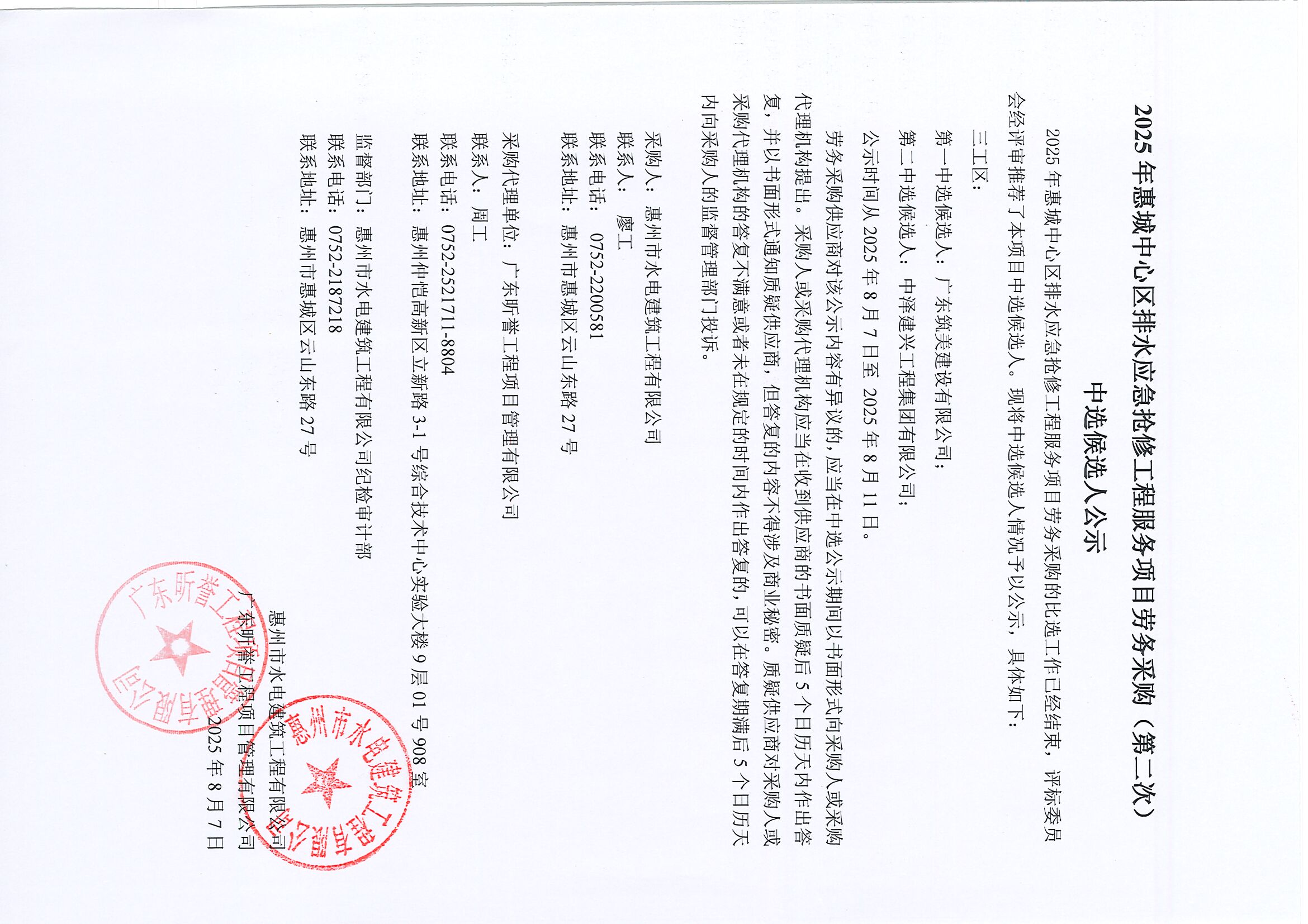 2025年惠城中心區(qū)排水應(yīng)急搶修工程服務(wù)項目勞務(wù)采購(第二次)中選候選人公示